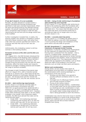 In this issue: If we don't stock it, it is not available, Amended versions of B1/AS1 and E2/AS1 are now live, B1/AS1 - slab reinforcing requirements, B1/AS1 - tying of slab reinforcing to foundation wall reinforcing now required, B1/AS1 - concrete slab free joints, B2/AS1 Amendment 7 - requirement for treatment of exposed timber framing, Winter and condensation, NZS 2418:2009 Calculation Method Tool on the BRANZ website, Cited standards in the revised E2/AS1, Next seminar - coming to grips with the revised E2/AS1 and B1/AS1