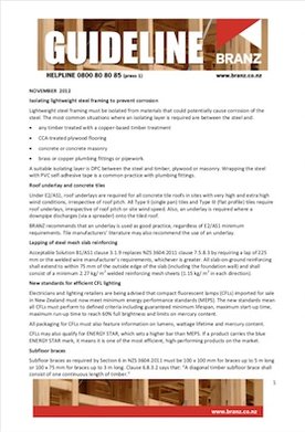 In this issue: Isolating lightweight steel framing to prevent corrosion, Roof underlay and concrete tiles, Lapping of steel mesh slab reinforcing, New standards for efficient CFL lighting, Subfloor braces, E2/AS1 cladding fixing requirements, Where stainless steel components must be used, Permitted bending radii for steel reinforcing, Cantilevered joists for decks, H1 compliance for glazing using the calculation method, H1 compliance for glazing using the calculation method, BRANZ seminars: Residential Retrofit and Renovation